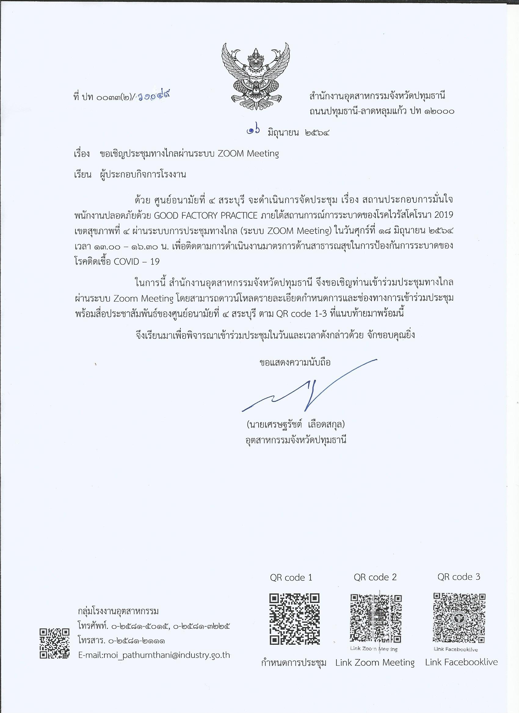 สำนักงานอุตสาหกรรมจังหวัดปทุมธานี ขอเชิญชวนเข้าร่วมประชุม เรื่อง สถานประกอบการมั่นใจพนักงานปลอดภัยด้วย GOOD FACTORY PRACTICE ภายใต้สถานการณ์การระบาดของโรคไวรัสโคโรนา 2019 เขตสุขภาพที่ 4 เพื่อติดตามการดำเนินงานมาตรการด้านสาธารณสุขในการป้องกันการระบาดของโรคติดเชื้อ COVID – 19 ในวันศุกร์ที่ 18 มิถุนายน 2564 เวลา 13.00 – 16.30 น. ผ่านระบบ Zoom Meeting โดยสามารถดาวน์โหลดรายละเอียดกำหนดการและช่องทางการเข้าร่วมประชุมพร้อมสื่อประชาสัมพันธ์ของศูนย์อนามัยที่ 4 สระบุรี ตาม QR code