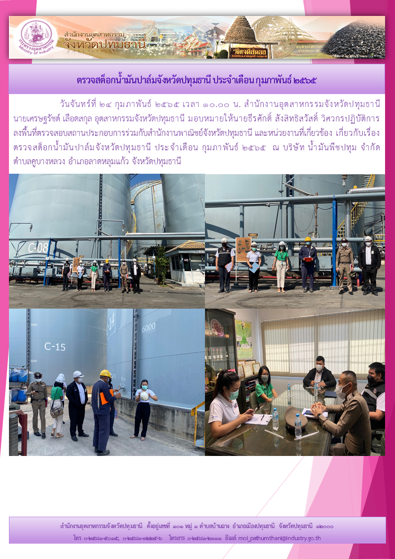 วันจันทร์ที่? 24 กุมภาพันธ์? 2565? เวลา? 10.00 น.? สำนักงานอุตสาหกรรมจังหวัดปทุมธานี นายเศรษฐรัชต์ เลือดสกุล อุตสาหกรรมจังหวัดปทุมธานี มอบหมายให้นายธีรศักดิ์ สังสิทธิสวัสดิ์ วิศวกรปฏิบัติการ ลงพื้นที่ตรวจสต็อกน้ำมันปาล์มจังหวัดปทุมธานี ประจำเดือน กุมภาพันธ์ 2565 ณ บริษัท น้ำมันพืชปทุม จำกัด