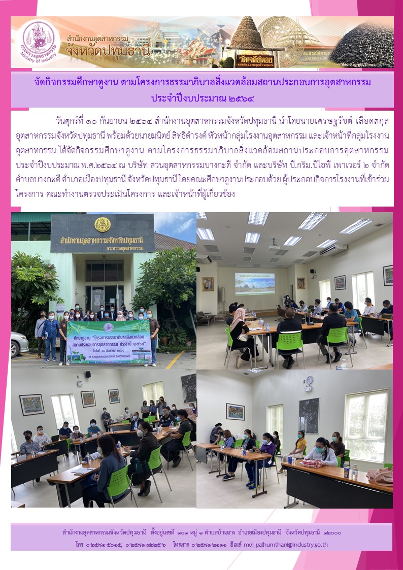 วันศุกร์ที่ 10 กันยายน 2564 สำนักงานอุตสาหกรรมจังหวัดปทุมธานี โดยกลุ่มโรงงานอุตสาหกรรม ได้จัดกิจกรรมศึกษาดูงาน ตามโครงการสร้างและพัฒนาศักยภาพเครือข่ายอุตสาหกรรมรักษ์สิ่งแวดล้อมประจำปีงบประมาณ 2564 ณ บริษัท สวนอุตสาหกรรมบางกะดี จำกัด ตำบลบางกะดี อำเภอเมืองปทุมธานี จังหวัดปทุมธานี