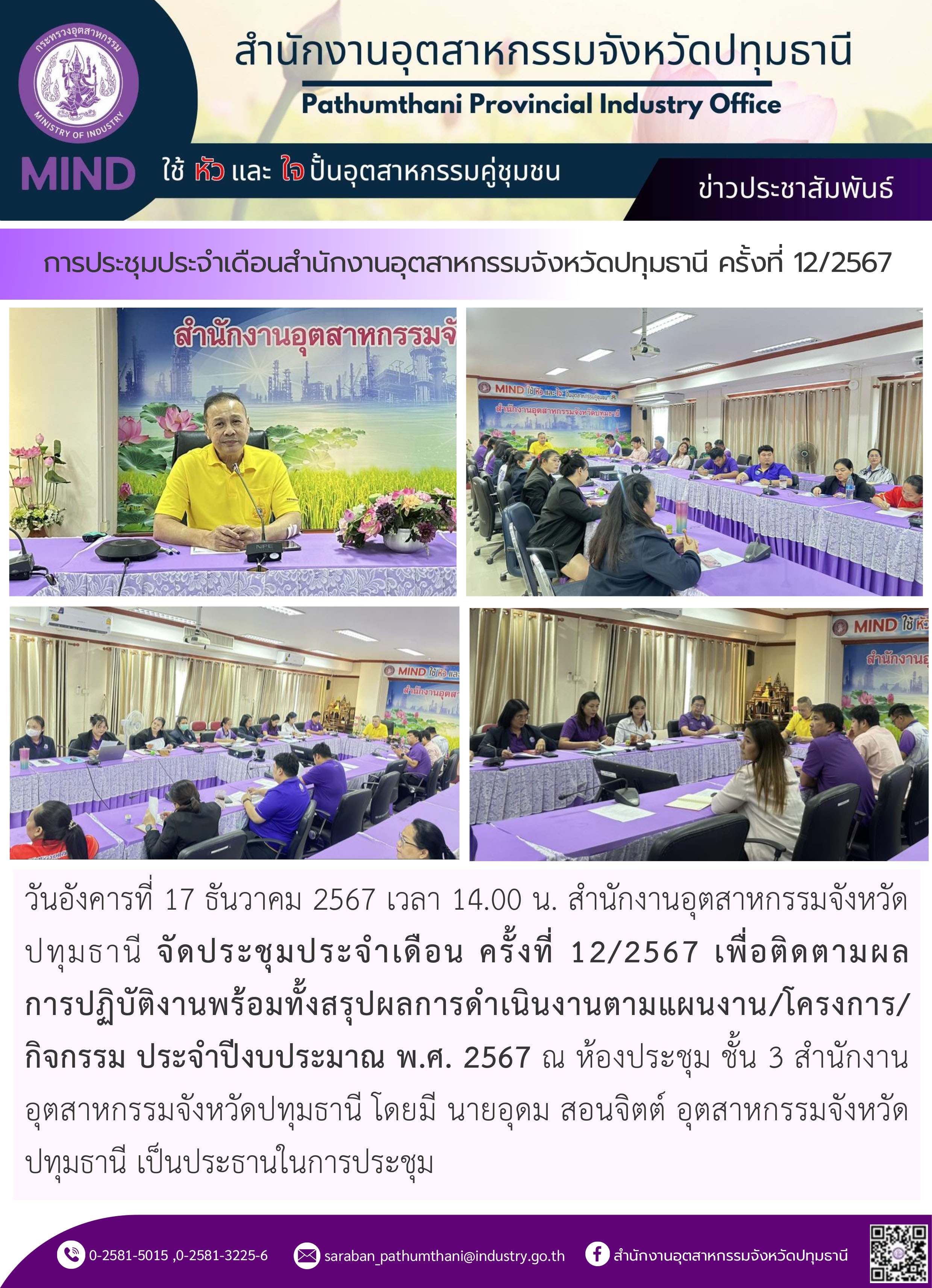 การประชุมประจำเดือนสำนักงานอุตสาหกรรมจังหวัดปทุมธานี ครั้งที่ 12/2567