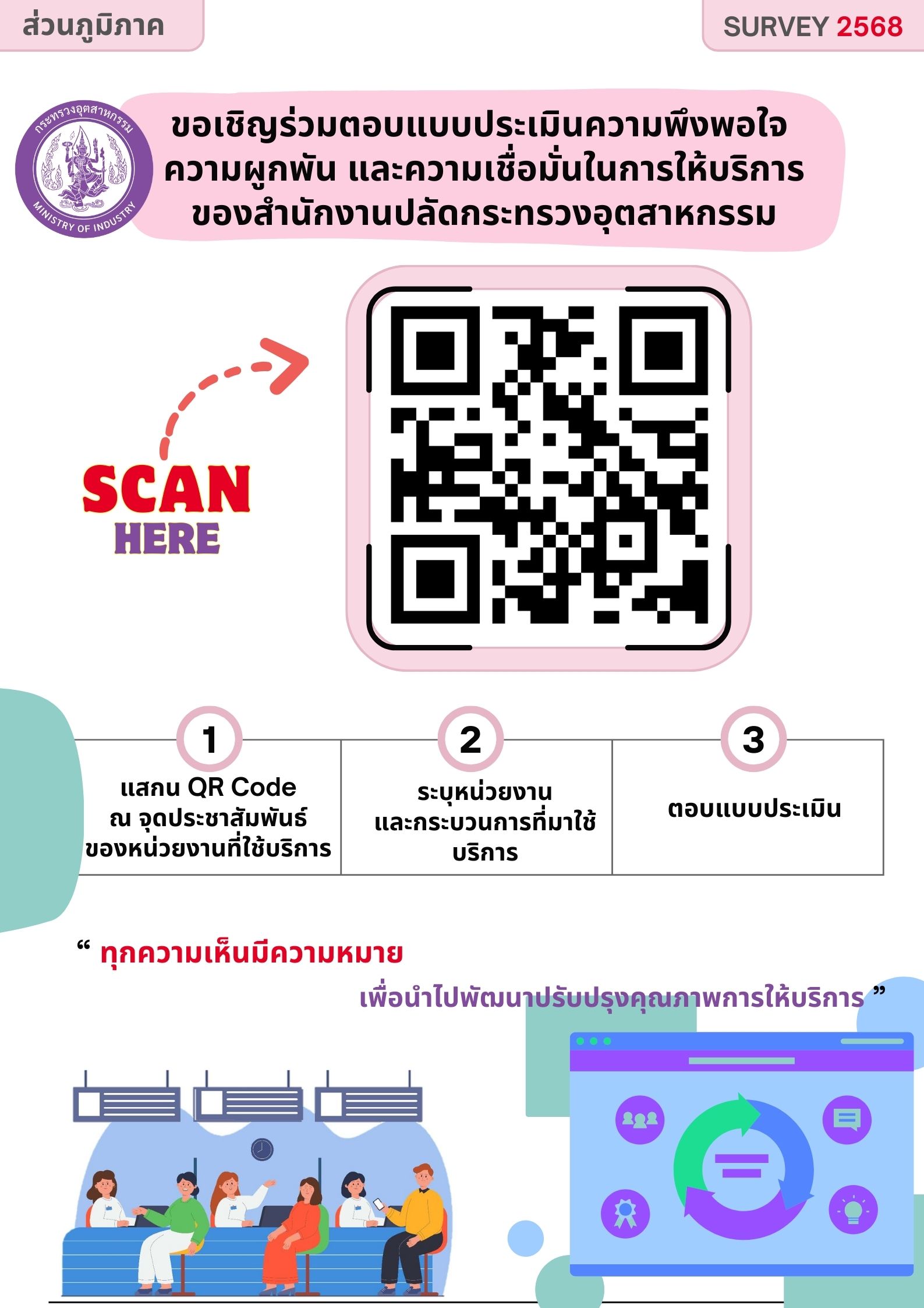 ขอเชิญร่วมตอบแบบประเมินความพึงพอใจ ความผูกพัน และความเชื่อมั่นในการให้บริการ ของสำนักงานปลัดกระทรวงอุตสาหกรรม